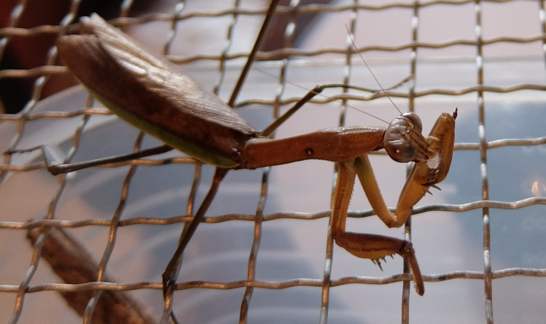最低気温が2℃くらいまで下がった日の朝、動けなくなっていたカマキリを保護して、夜だけ家に入れて数日間お世話をしていました。ヨーグルト、甘えびの刺身を口元に運んであげると、口を動かして食べ、ちょっとは動いていましたが、最後の2日は、ほぼ一日、夫の近くでじっとおとなしく過ごしていました。