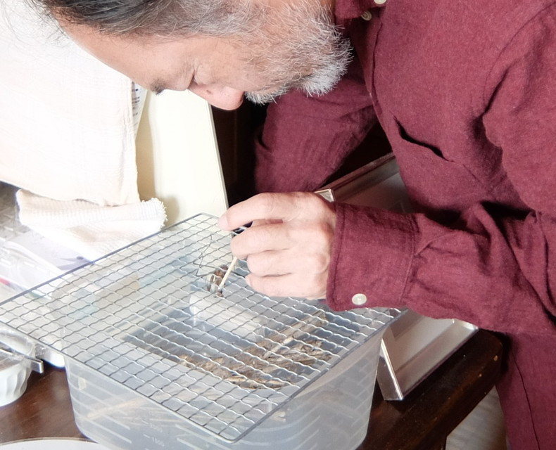 夜には結構な量の甘えびを食べ、夫から水をもらい、翌朝には、ぶら下がった状態のまま死んでいました。いずれは死ぬ運命だとはわかっていても、弱っているのを見ると助けたくなった私たち。あちこちで見つけたカマキリの卵から、来年小さな子カマキリが産まれてくるのを楽しみに待ちたいと思います。