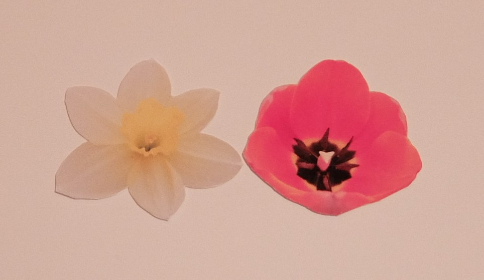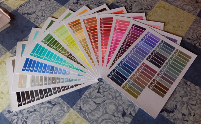 最初に切り出された2月と3月の花を受け取って、我が家で背景色の基準となる色を選びました。600色以上ある色見本リストの中から、花が最も美しく見える背景色の色見本を選ぶのですが、1つはすぐ見つかり、もう一つは少し苦戦しました。