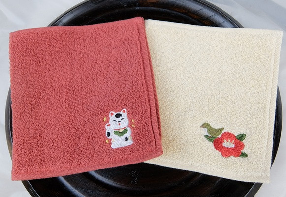招き猫とメジロ椿のワンポイント刺繍も可愛いです。