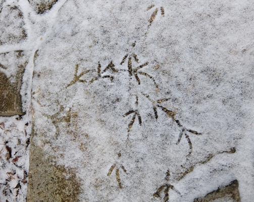 我が家のスズメ用の玄米を狙って訪れる“はとぽ(キジバト)”の足跡です。