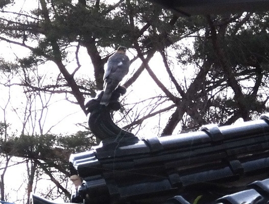 写真の写りが悪くて申し訳ありません。これはガラモン家の屋根瓦に止まった小型の猛禽類の鳥、ツミの写真です。
