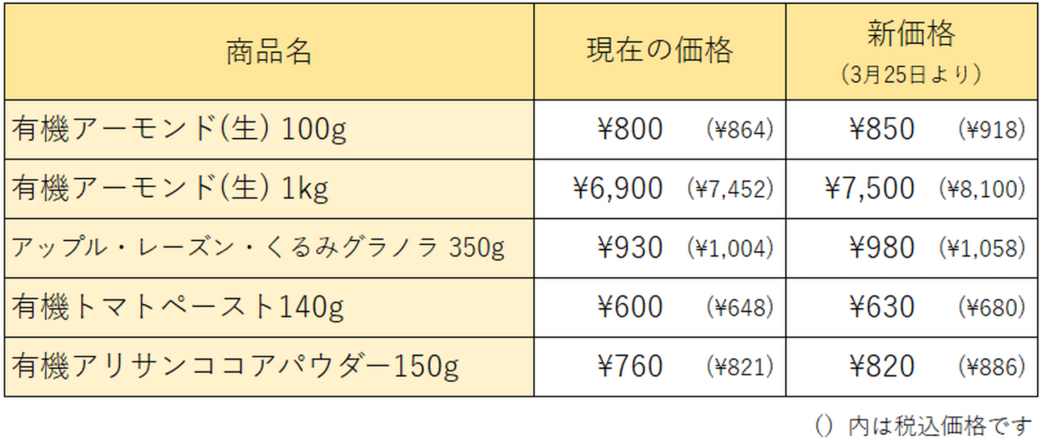 3月25日より、アリサン商品の一部が値上げになります。