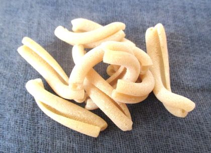 カサレッチェは、市販のマカロニを捻ったような形で、イタリア語で「家庭の」「手作りの」という意味があるそうです。