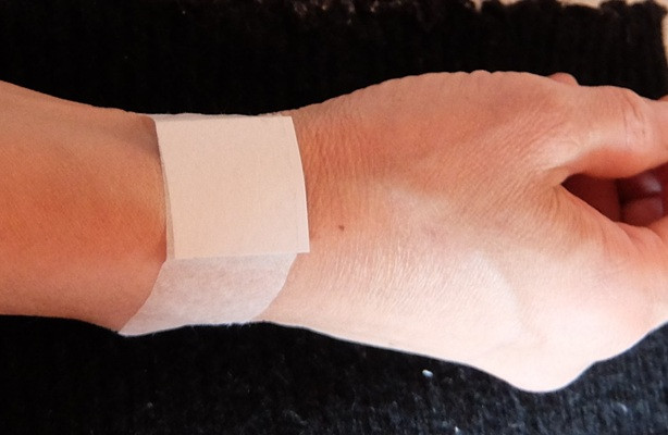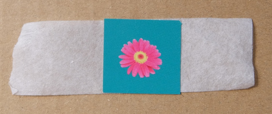 実験的に、2026シャンティ・フーラカレンダー4月のピンクのマーガレット部分を切り取って、ズキズキする手首に貼ってみました。
