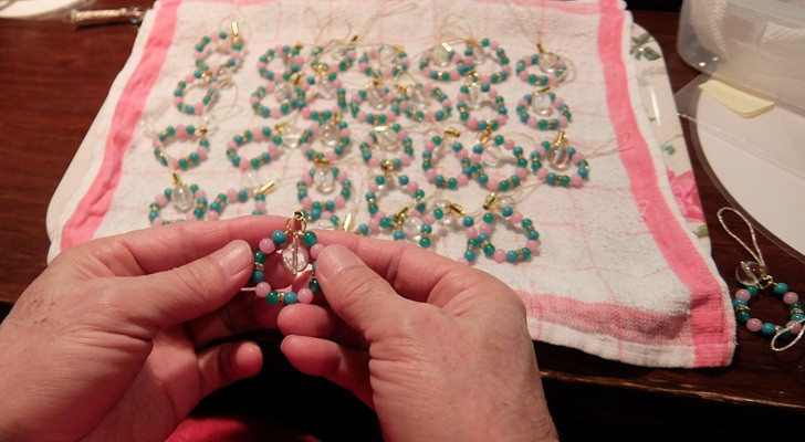 細かい作業は全て、とても手先の器用なミルキーユさんが担当。私は、ビーズをワイヤーに通し、ストラップの円環にワイヤーの両端とぴよちゃんビーズをはめ込む、ちょっと力の要る作業を担当しました。