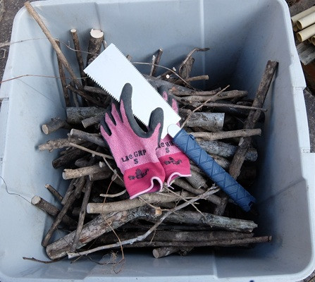 我が家は、灯油・薪兼用釜でマコモ風呂を沸かしています。普段はオガライトという燃料を使っているのですが、昨年1月に大量に椿の木を伐採したので、その剪定枝を30㎝位にノコギリで切って、燃料の足しにしているパータ。