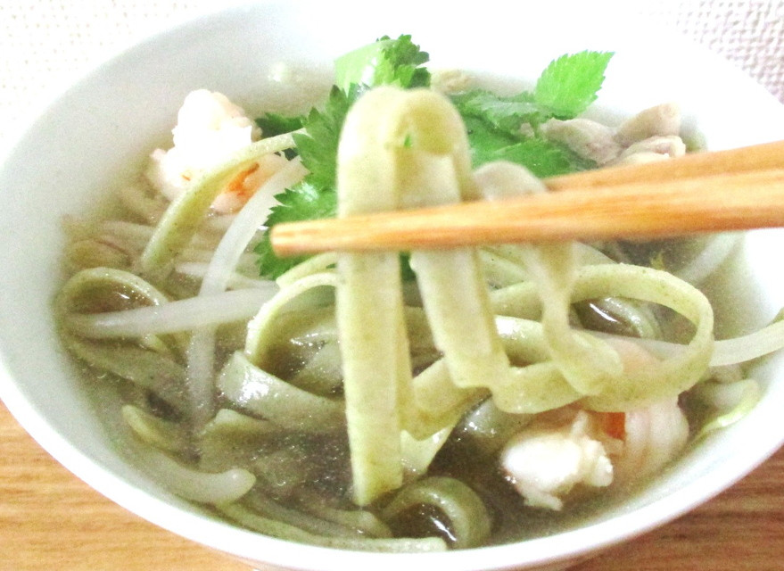 ライスパスタと言うよりも、米粉で作ったモロヘイヤ入りうどんと表現したほうが、