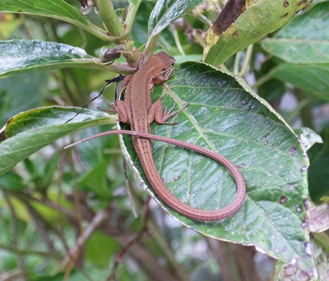 経筋体操をしていたら、目の前のアジサイの葉っぱのベッドで寝ている生き物を見つけました。気持ちよさそうに半眼になってゆったりする小さいカナヘビ。リラックスしていて、私が寄っても逃げませんでした。