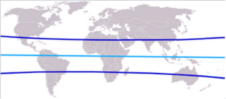 上の青線が北回帰線、中央の水色の線が赤道、下の青線が南回帰線。(ヴィンケル図法のため、緯線・経線ともにゆがみがある)(Wikipedia