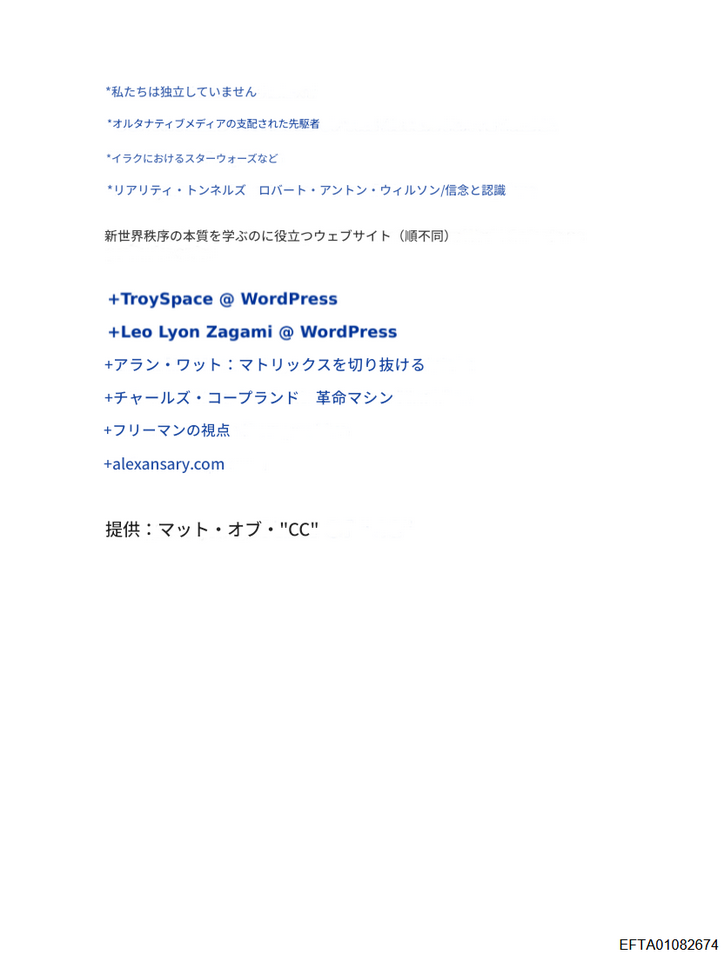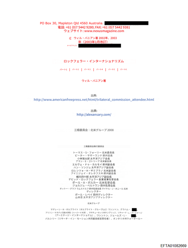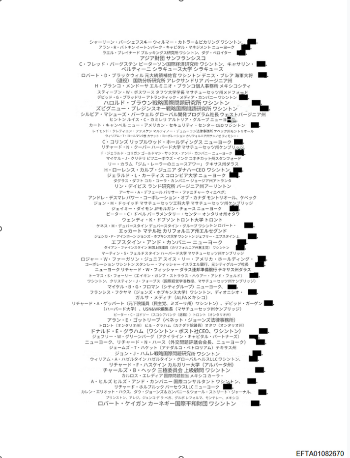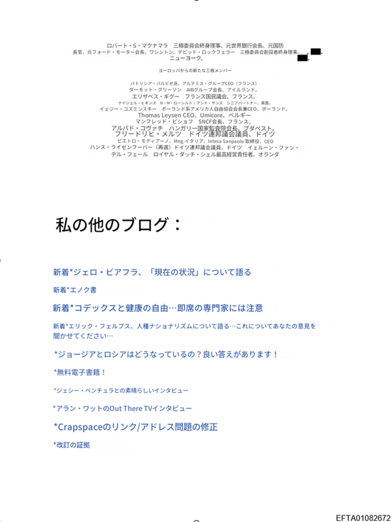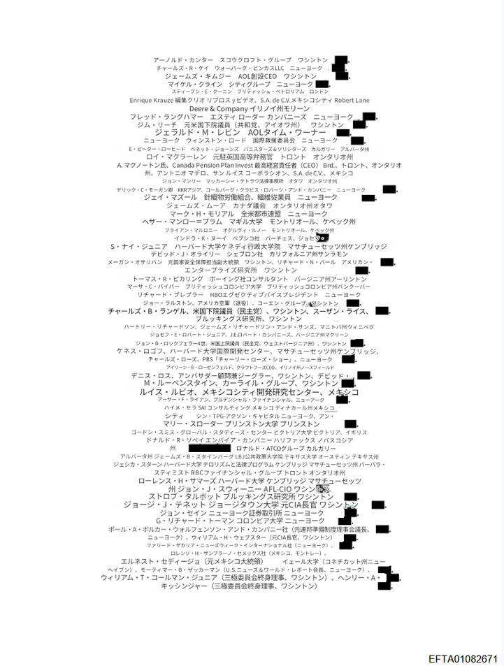 その他、イルミナティの組織として外交問題評議会ビルダーバーグ会議三極委員会などの名称が挙げられています。3ページ以降には「三極委員会」の北米グループのメンバーリストがあります。このリストは、こちらの『三極委員会:北米グループ2008』が出典のようです。