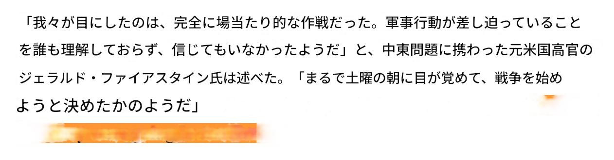 Gerald Feierstein, a former senior U.S. diplomat (CIA) called the response “a completely ad hoc operation… like they woke up and decided to start a war.”元米上級外交官(CIA)のジェラルド・ファイアスタインは、この対応を「完全に場当たり的な作戦だ。……まるで、目が覚めていきなり戦争を始めることにしたかのようだ」と評した。