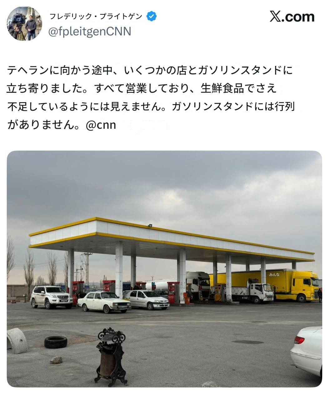 Media reports in the West are the opposite of reality. They make it seem Iran’s capital, Tehran, is being destroyed. However, a CNN correspondent who is actually there posts on X: Stopped at several shops and gas stations on the way to Tehran. Everything is open, and there don’t appear to be shortages, even of fresh produce. No lines at gas stations.”西側メディアの報道は、現実とは正反対である。彼らはテヘランが壊滅的な打撃を受けているかのように描き出しているが、実際に現地にいるCNN特派員はXでこう報告している。「テヘランへ向かう道中、いくつかの商店やガソリンスタンドに立ち寄ったが、どこも通常通り営業しており、生鮮食品すら不足している様子はない。ガソリンスタンドに行列はできていない。」