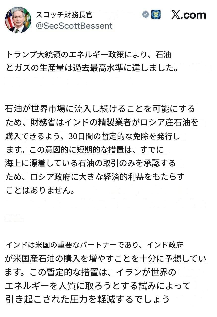 In addition to lying about Kurds, the US is lying about India. The US Treasury Department says it is issuing a temporary 30-day waiver to allow Indian refiners to purchase Russian oil. (see tweet). However, the reality is that the Indians refused a US demand to buy their own oil instead of Russian oil. So, the US is pretending it gave India permission to do this in order to save face.米国はクルド人について嘘をついているだけでなく、インドについても嘘をついている。米財務省は、インドの製油業者がロシア産原油を購入できるよう、30日間の暫定的な免除措置を講じると発表した。しかし実態は、ロシア産の代わりに米国の石油を買えという要求をインド側が拒否したのである。つまり米国は、面目を保つために、あたかも自分たちがインドに許可を与えたかのように装っているに過ぎない。