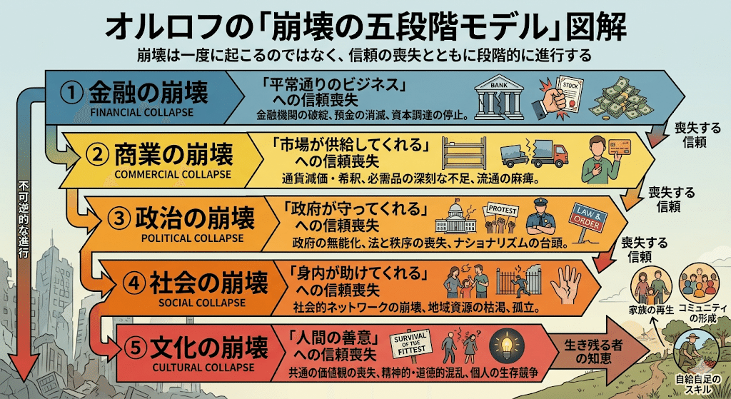 本書は、崩壊を「金融→商業→政治→社会→文化」の五段階に分類し、各段階で「何への信頼が消えるか」を軸に分析する。