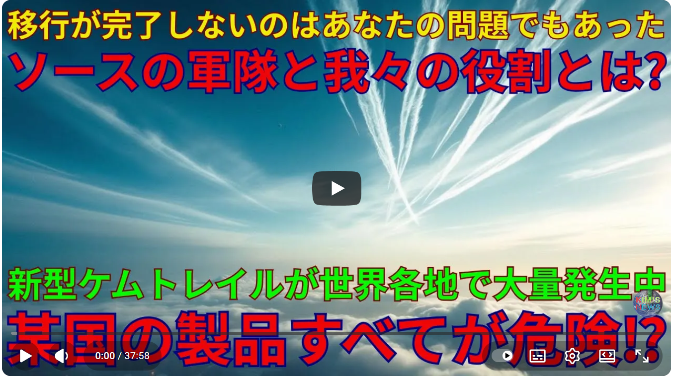 “ケムトレイルには、さまざまな重金属や、私たちにとって有害な物質が数多く含まれていることは、すでによく知られているところです(1分27秒)。…私たちは、各国でケムトレイルの散布を主導している複数の軍関係者とも話をしてきました。そして彼らは皆、これらのケムトレイルに含まれている化学物質や金属が中国から供給されていることを認識しています。それどころか、実際にはそれを自ら推進しており、米軍を含め関係するすべての軍がその使用に同意しているのが現状です。アメリカ市民を守るという建前はどこへ行ってしまったのかと言いたくなるところです。そして、彼ら自身もそのことを十分に分かった上で実行しています(1分53秒)。…ただし、問題はケムトレイルだけにとまりません。同じものが、他にも多くのものに含まれていることが分かってきました(2分39秒)。…そして、改めて詳細なリサーチを行った結果、そこには私たちがナノテックおよびフェムトテックと呼んでいるものが大量に含まれていることが判明しました(2分59秒)。…この特定タイプのナノテックとフェムトテックは、実際に皮膚を透過して体内に入り込むことができます。当然ながら、吸い込めば呼吸器からも体内に取り込まれますし、実際にそのような形で作用していきます(3分26秒)。…中国が製造しているあらゆる製品には、このナノテックとフェムトテックが組み込まれていることが分かっています。衣類、食品、電子機器など、中国製のあらゆる製品に、この特定のテクノロジーが組み込まれており、それらはある非常に興味深いAIシステムと接続されていたのです。この技術は、肉体の操作、精神の操作、さらには可能であれば魂のレベルにまで干渉することを目的として設計されていました。要するに、ホモ・サピエンスという有機的な存在を、ボタンひとつで制御可能なサイボーグへと変えていくための仕組みとして構想されていたのです。(4分23秒)”と説明しています。